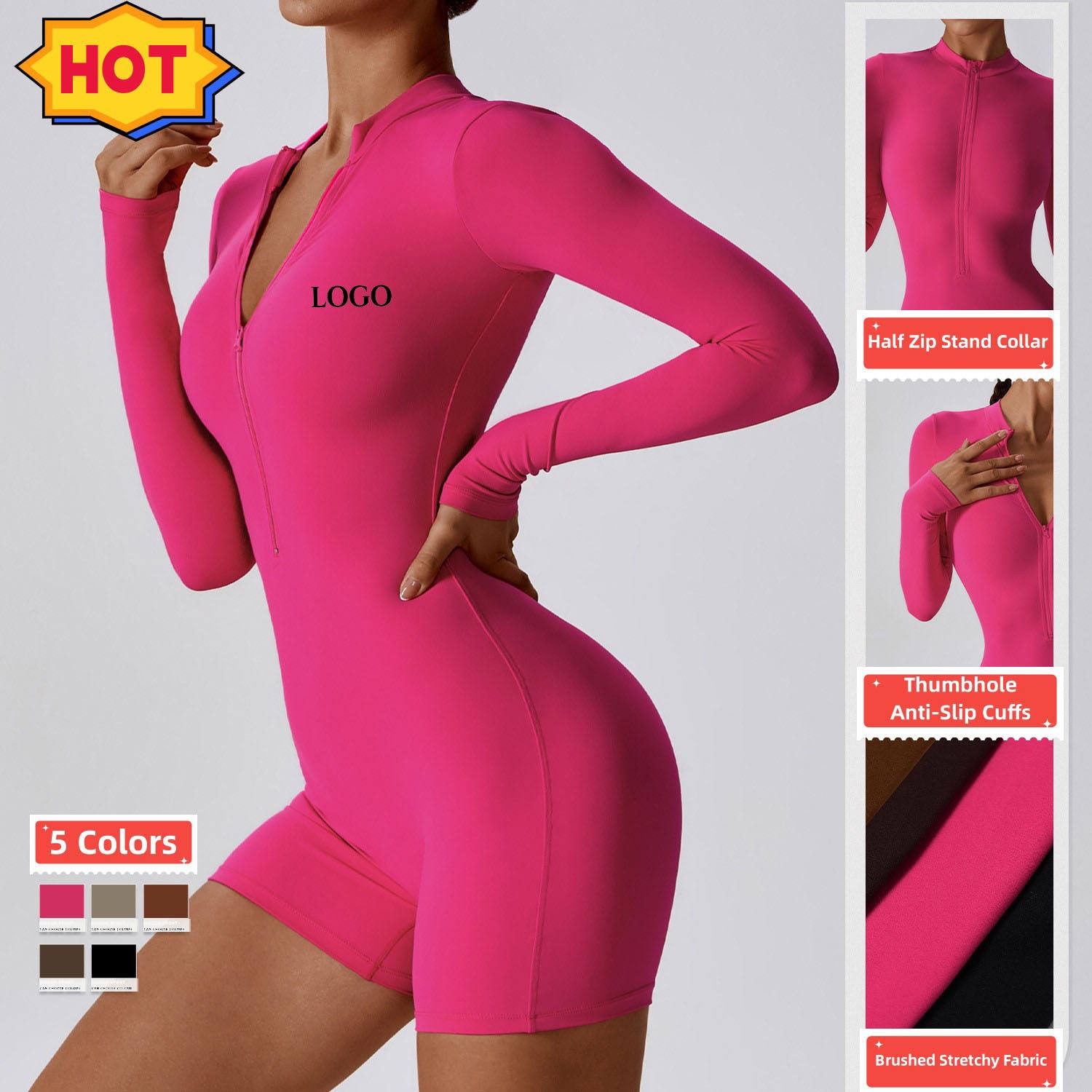 Half Zip Brushed 78%Polyamide 22%Elastane Stretchy Long Sleeve Short Sportswear Fitness&Yoga Wear Body Suit Women Jumpsuit